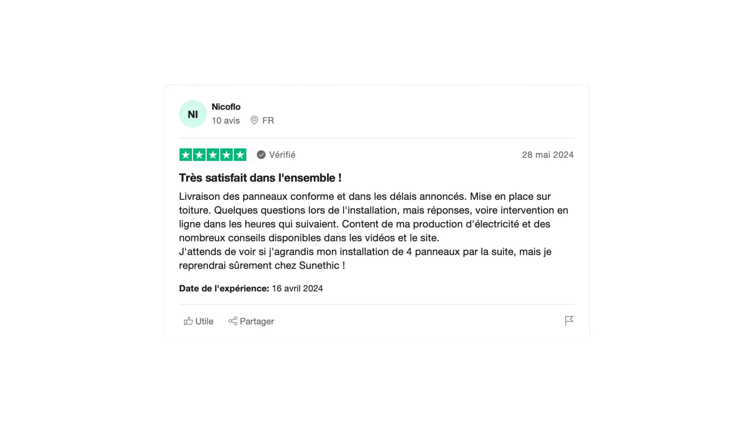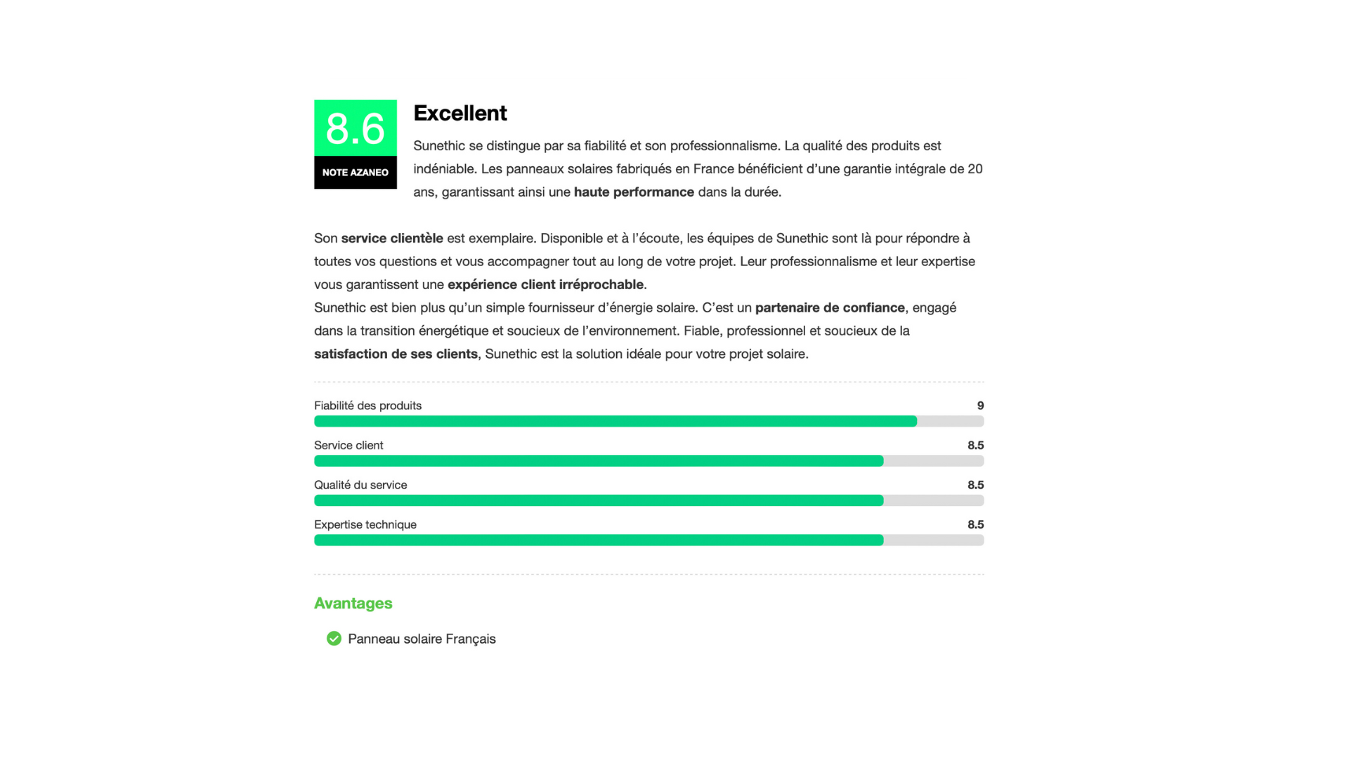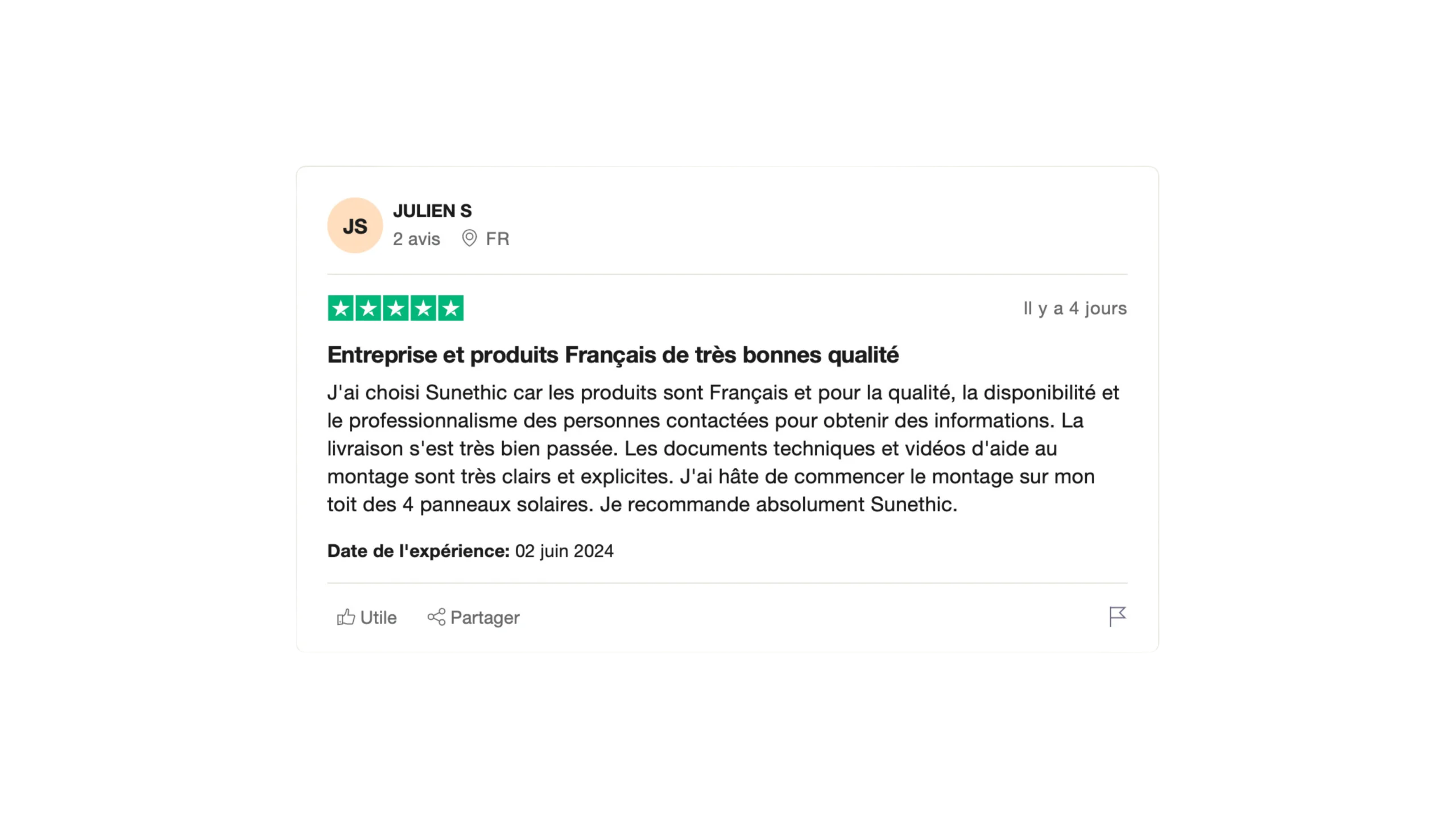 Chez Sunethic, nous sommes extrêmement reconnaissants de tous ces excellents avis clients reçus, qui sont une source précieuse d’encouragement et de motivation pour continuer à vous offrir des produits de qualité supérieure, pour renforcer notre crédibilité et notre image de marque, mais aussi pour inspirer de nouveaux utilisateurs à adopter nos solutions énergétiques renouvelables, accessibles à tous et qui soutiennent l’industrie française.
