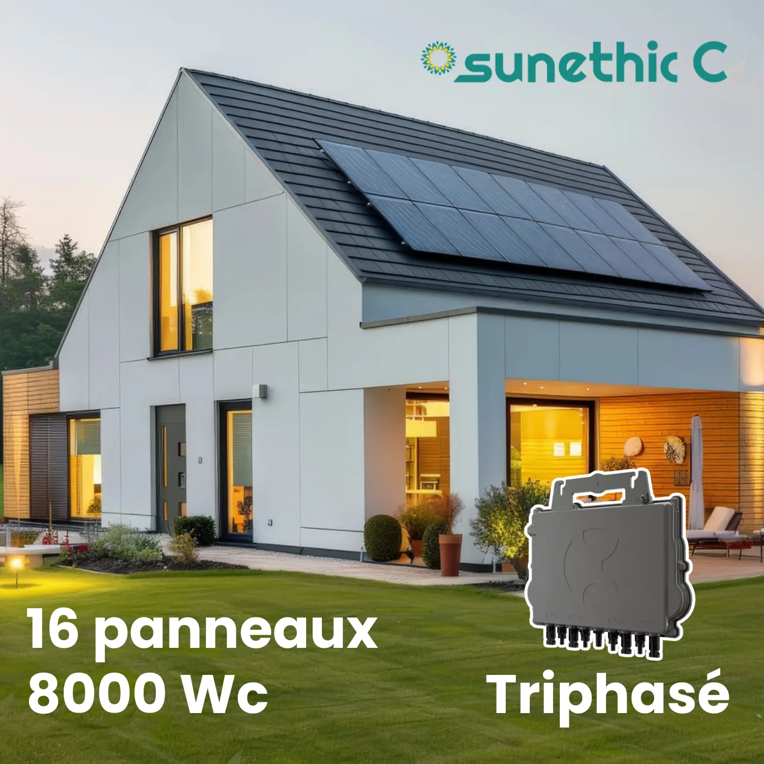 Sunethic C8000 triphasé est une installation solaire française 8kWc clé en main triphasé de 16 panneaux qui comprend le kit solaire français complet premium, la visite technique, la pose et le raccordement par un installateur RGE sélectionné par Sunethic, le suivi de projet par Sunethic via un interlocuteur unique, toutes les démarches administratives, et les garanties fabricant de 25 ans sur micro-onduleurs et panneaux solaires.