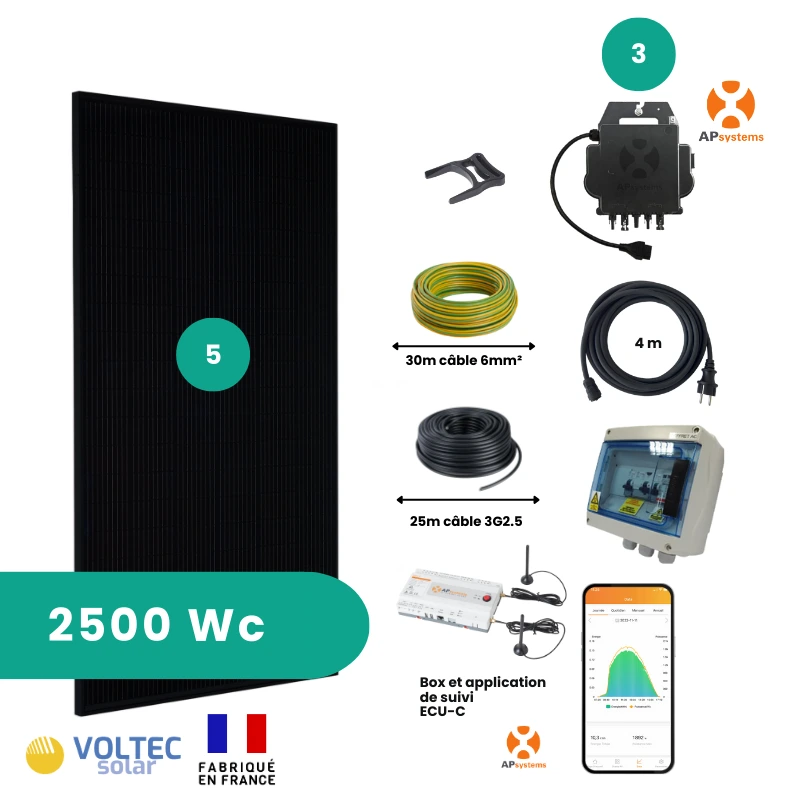 Sunethic T2500 est un kit solaire autoconsommation toiture 2500w français Voltec Solar, livré complet sans support de fixation à rajouter en option, prêt à être installé et à brancher directement au tableau électrique, en 1h par panneau.