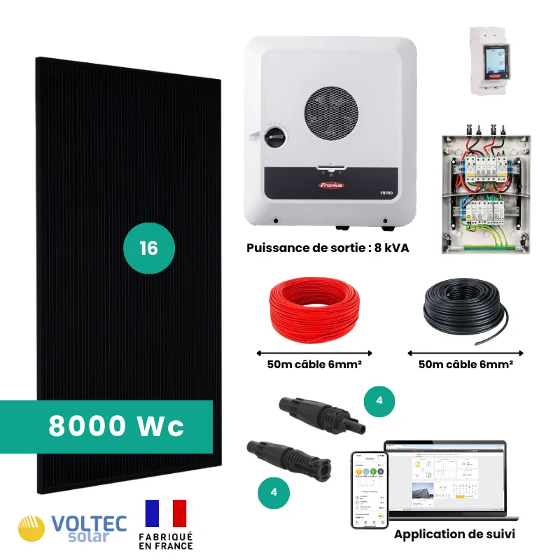 – seize panneaux solaires Voltec Solar de 500Wc bas carbone, fabriqués en France, cellules TOPCon haut rendement 23%, full black, avec verre très résistant à la grêle 3,2mm