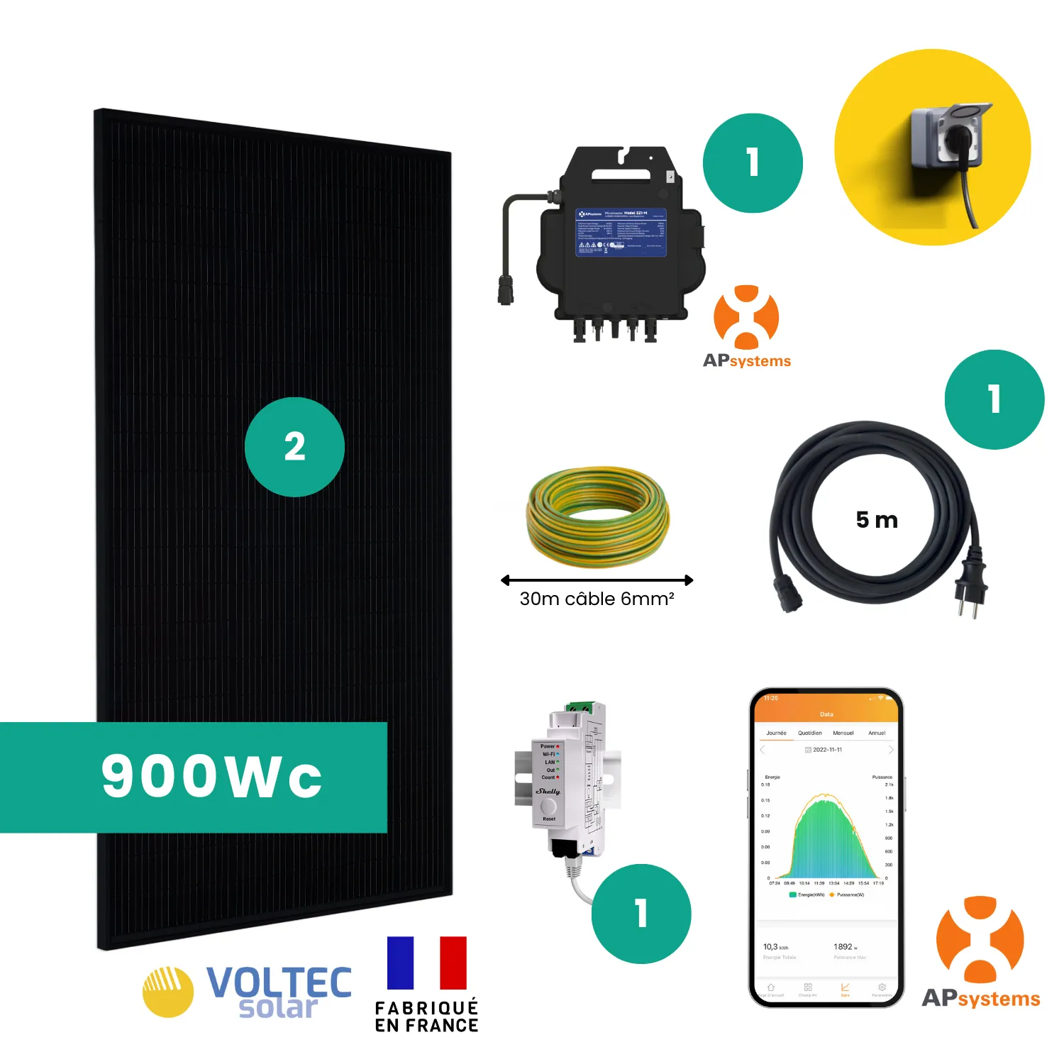 Le kit est équipé de deux panneaux solaires Voltec Solar TARKA 450 Wc, fabriqués en France, reconnus pour leur excellent rendement et leur faible empreinte carbone.